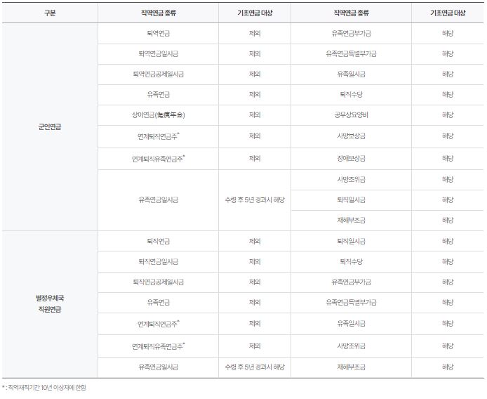 표를 보시면 퇴직일시금, 퇴직유족연금부가금, 퇴직수당, 요양급여 등은 기초연금 대상이 됨을 알 수 있습니다. 다음으로 군인연금과 별정우체국 직원연금에도 일정한 경우 아래의 사항에 해당한다면 기초연금 대상이 될 수 있습니다.