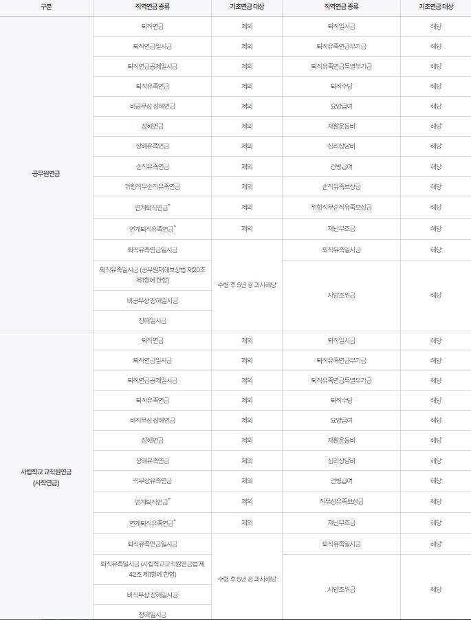 공무원연금, 군인연금 등 을 수급권자와 그 배우자는 원칙적으로 기초연금 수급대상에서 제외되지만 수급받는 연금의 종류에 따라 기초연금 대상 여부가 달라질 수 있습니다. 그 내용이 아래의 표에 나와 있습니다. 우선 공무원연금과 사학연금입니다.