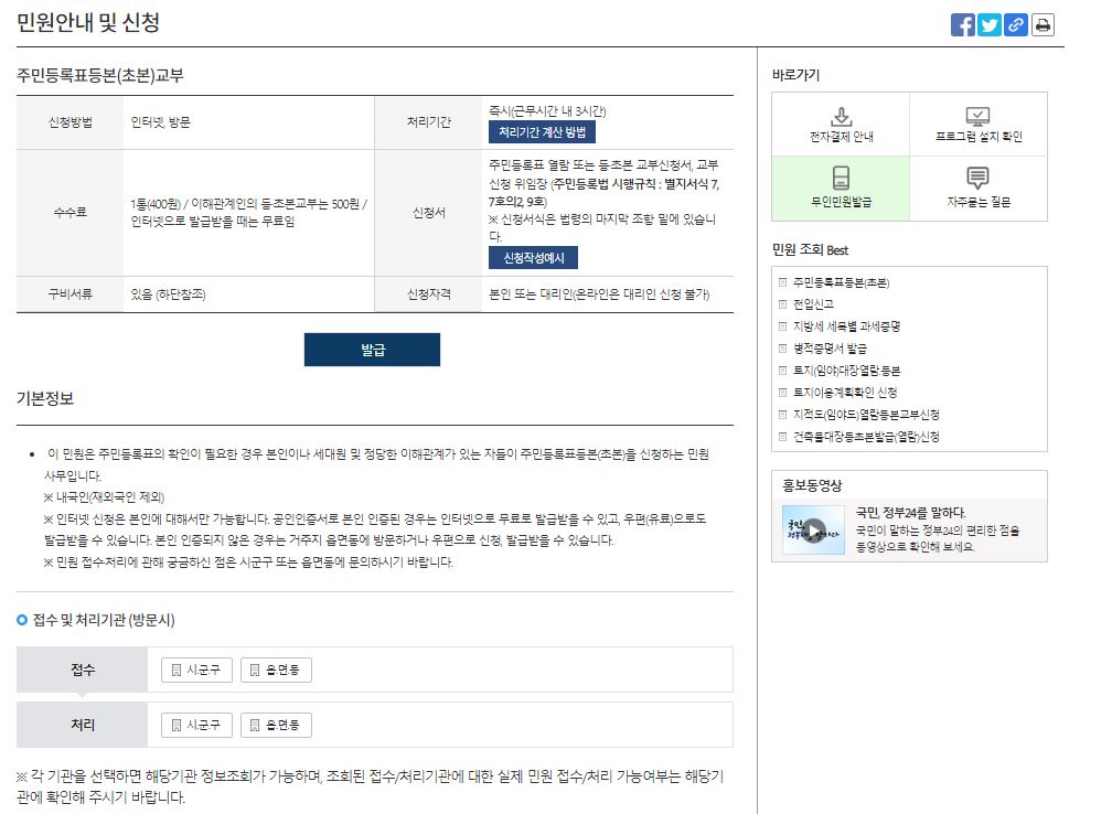 마. 각 지역에 비치되어 있는 무인민원발급기에서도 발급이 가능하며 발급시간과 발급수수료는 지자체 사정에 따라 달라질 수 있습니다.