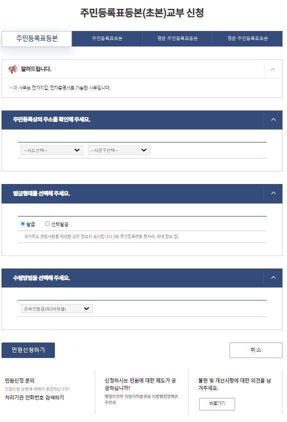 마. 민원신청하기를 누르면 서비스신청내역(정부24 홈페이지 -> 회원 또는 비회원 로그인 -> MyGOV -> 나의 서비스 -> 서비스신청내역) 에서 주민등록표등본을 직접 출력하거나 민원 처리 내역을 확인할 수 있습니다.