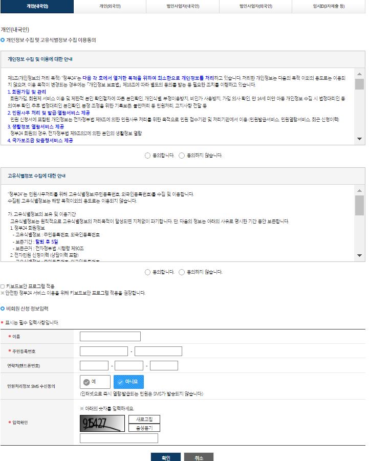 - 비회원인 경우 개인정보 수집 및 고유식별정보 수집 이용동의와 고유식별정보 수집에 대한 안내 모두 '동의합니다' 체크 후 신청정보를 입력하고 확인을 누릅니다